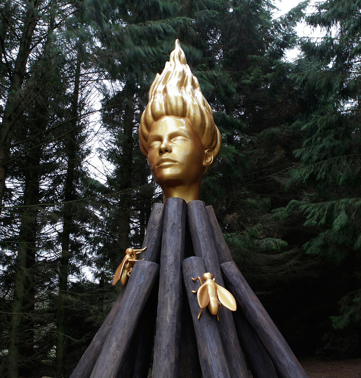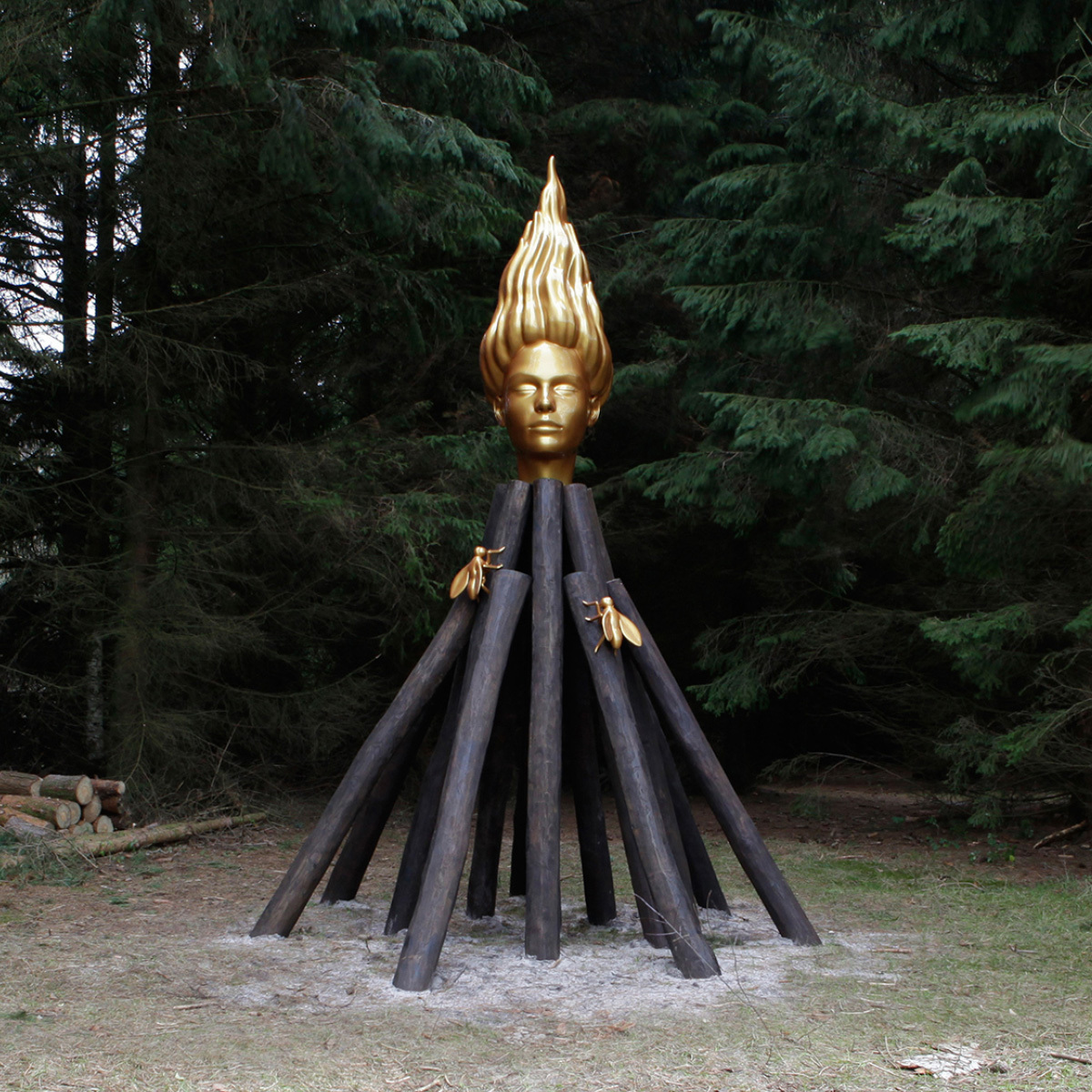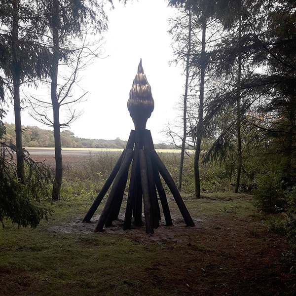 Ole Tersløse has created a site specific installation for Skovsnogen Deep Forest Artland. The installation resembles a campfire with a flaming head with peacefully closed eyes.
