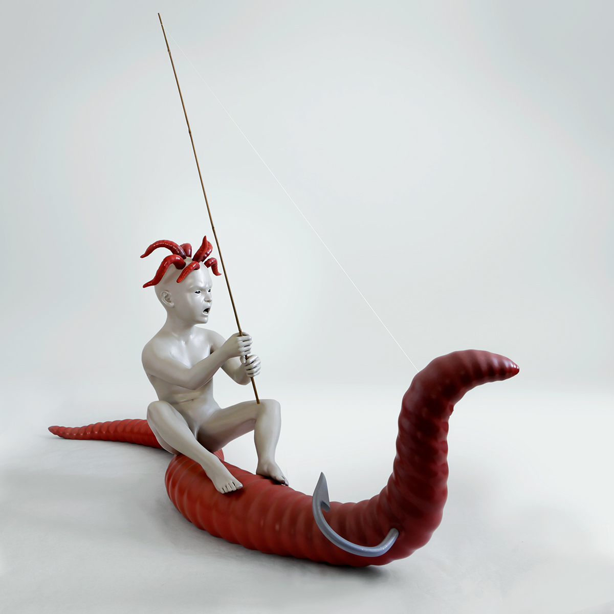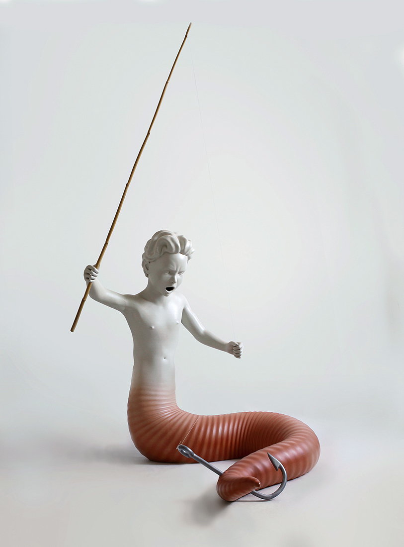 However, the project named 'Catch' embracing large 3d-printed sculptures and inkjet prints shows angling as a bloody battle. The little boy is still fishing with a bamboo cane, but now he definitely hooks something.