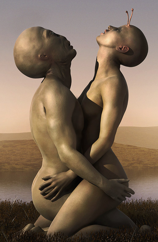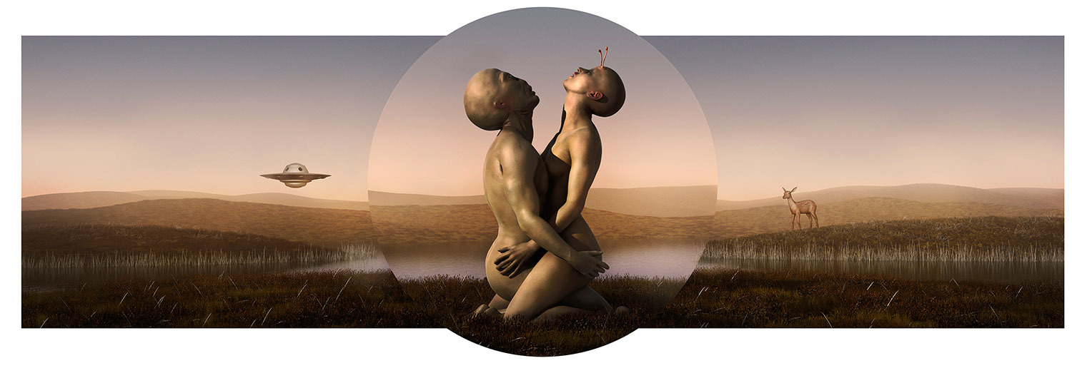 The work depicts two aliens having kama sutra sex in Thy National Park - the place where Jens Søndergaard found the scenes for his paintings.