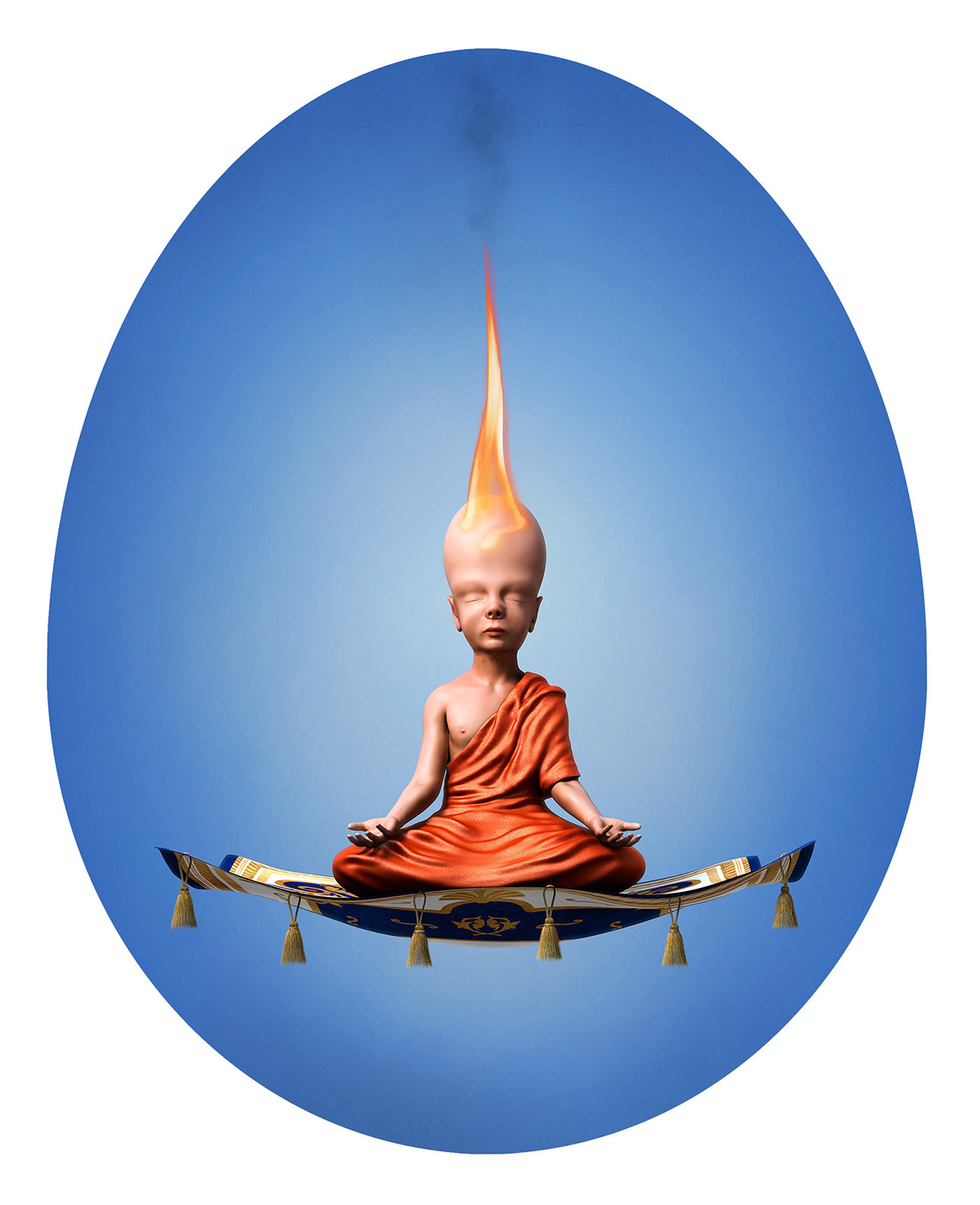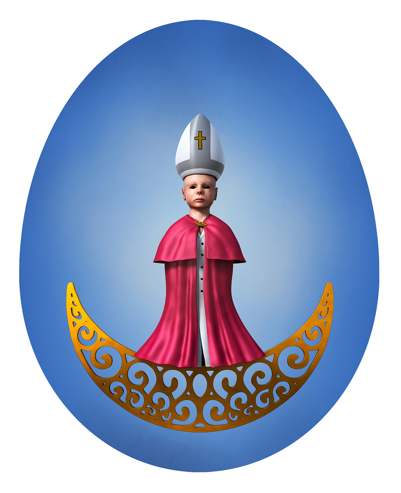 "Religious Hybrids" is a contemporary series of icons, reimagining elements from belief systems that have traditionally been in opposition to each other.The pictures exclusively feature children, symbolizing a new generation that strives to bridge the gap between traditionally adversarial beliefs and ideologies. Sometimes, this bridging appears logical, while at other times, it seems mysterious. Inspired by conflicts between Western freedom rights and dogmatic belief systems that tend to limit these rights, the series neither mocks nor overly glorifies religion. Instead, the images bring to life a surreal universe where symbols and iconography from various religious traditions coexist in an enigmatic and aesthetically harmonious manner.